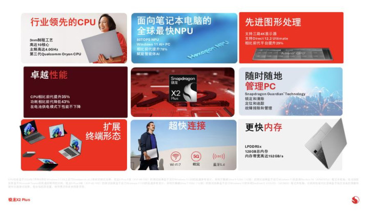 骁龙X2 Plus平台通过智能能效管理,实现了多日电池续航,让用户能够长时间脱离电源工作、创作或娱乐,而无需牺牲性能。在连接方面,平台支持最新的 Wi-Fi 7 和可选5G 连接,确保用户随时随地获得高速、稳定的网络体验。智能音频与摄像头技术进一步提升了远程协作与沟通的品质。安全层面,骁龙X2 Plus提供了从开机到日常使用的全方位保护,包括基于高通SPU与微软Pluton的芯片到云安全架构、生物识别认证以及自动感知检测。可选的Snapdragon Guardian™技术更融合了企业级防护与简易管理,实现基于硬件的终端安全维护。