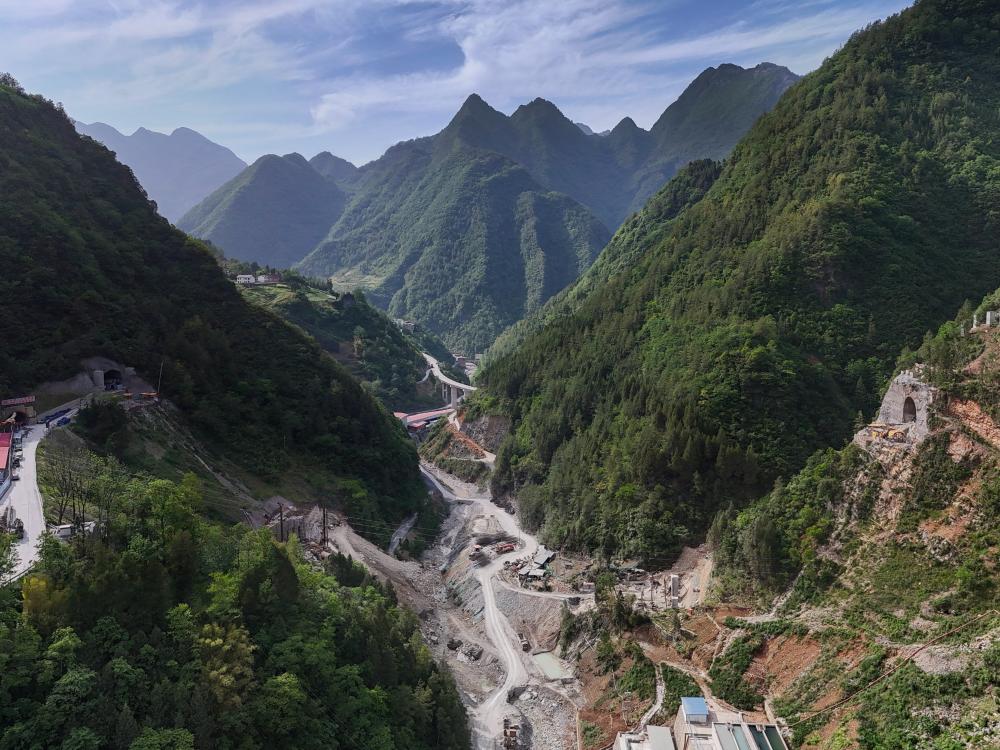 这是5月2日拍摄的西渝高铁全线控制性工程向阳一号隧道出口(右)和向阳二号隧道进口(无人机照片)。新华社记者王曦摄
