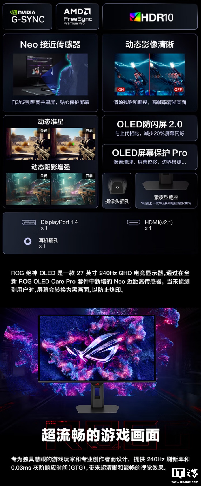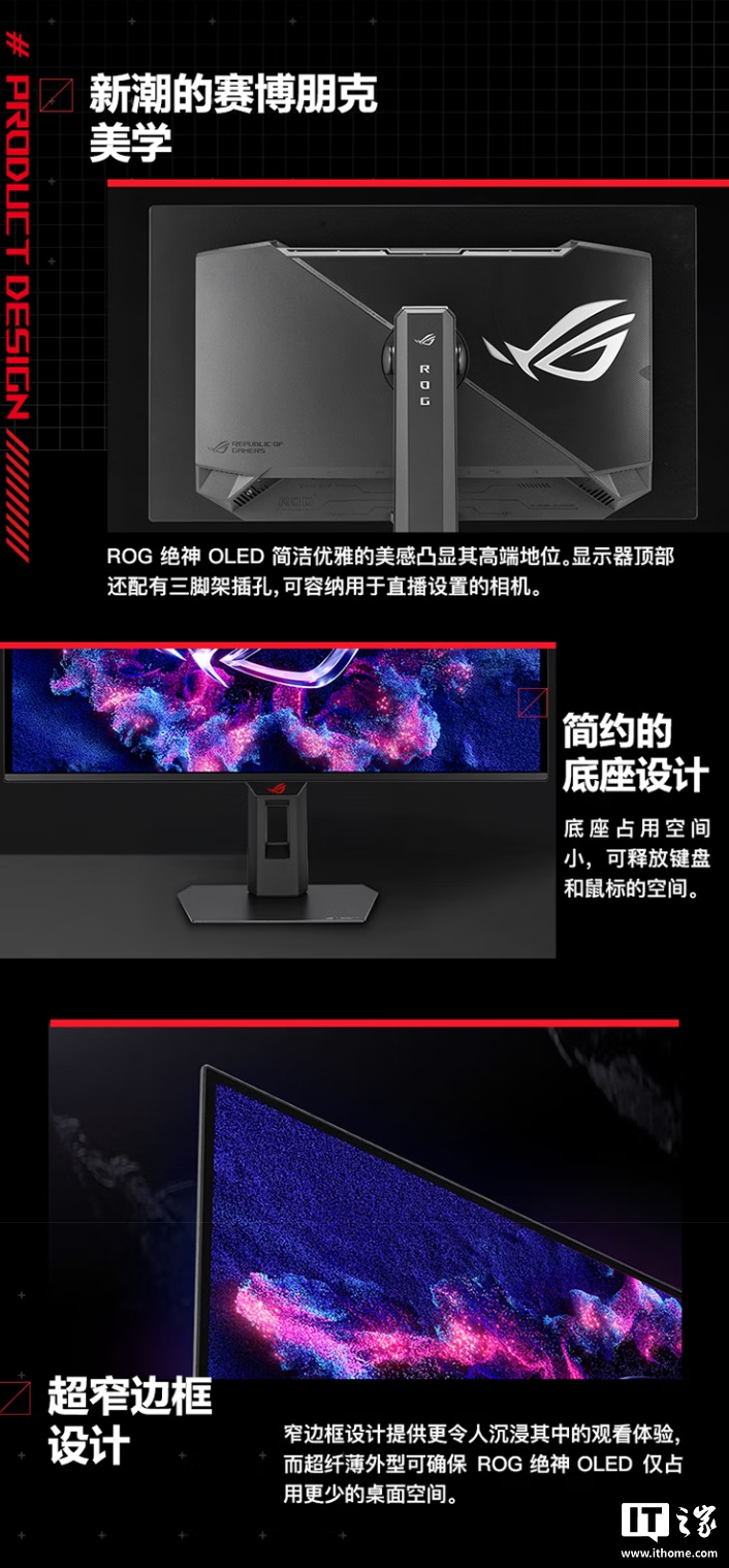 IT之家了解到,这款显示器配备 QD-OLED 面板,对比度可达 1.5M:1,响应时间为 0.03ms,覆盖 99% DCI-P3 色域创惠优配,出厂 ΔE<2,兼容 HDR 10,带有秒表、定时器、十字准星、FPS 计数器、狙击手等电竞辅助功能。