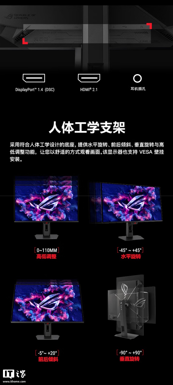 此外,这款显示器还带有一个 DisplayPort 1.4 接口、一个 HDMI 2.1 接口、3.5mm 耳机插孔,配备人体工学支架,支持调整高度、水平、前后倾斜、垂直旋转等。