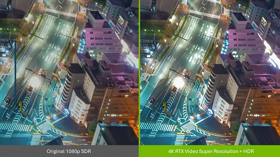 除此之外,RTX加速方案还集成了全新的RTX视频超分辨率(RTX VSR)技术。能够以更快的速度将低分辨率视频超分至4K,并实现更好的边缘锐化和伪影抑制效果。